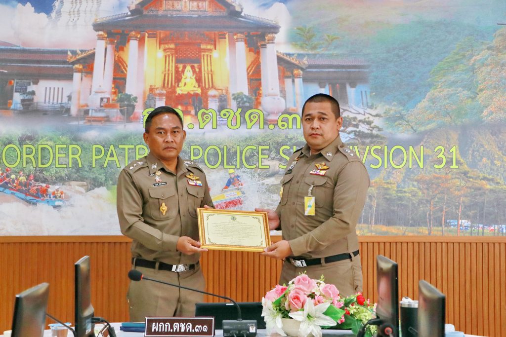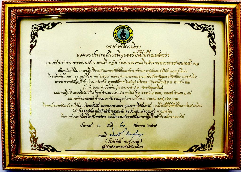 เมื่อวันที่ ๔ ต.ค.๖๗ พ.ต.อ.อดุลย์ สิริสิทธินันท์ ผกก.ตชด.๓๑ เป็นประธาน การประชุมบริหาร กก.ตชด.๓๑ ประจำเดือน ตุลาคม ๒๕๖๗ พร้อมมอบประกาศเกียรติคุณ ของกองกำลังผาเมือง ให้กับกองร้อยตำรวจตระเวนชายแดนที่ ๓๑๖ เนื่องจากมีผลการปฏิบัติงานด้านการสกัดกั้นและปราบปรามการลักลอบตัดไม้ทำลายป่าดีเด่น โดยมี พ.ต.ท.ฐิติพงษ์ ชื่นสมบัติ รอง ผกก.ตชด.๓๑,พ.ต.ท.ปรัชญลักษณ์ วิลาทัน รอง ผกก.ตชด.๓๑,พ.ต.ท.ดุสิต ประสิทธิ์สุวรรณ รอง ผกก.ตชด.๓๑ พร้อม สว.งาน ๑-๖,ผบ.ร้อย ตชด.๓๑๑-๓๑๗,หน่วยเก็บกู้วัตถุระเบิด,ครูใหญ่ รร.ตชด.ในสังกัด และนายตำรวจสัญญาบัตร ร่วมแสดงความยินดี ณ ห้องประชุม จุฬาร่วมใจ กก.ตชด.๓๑