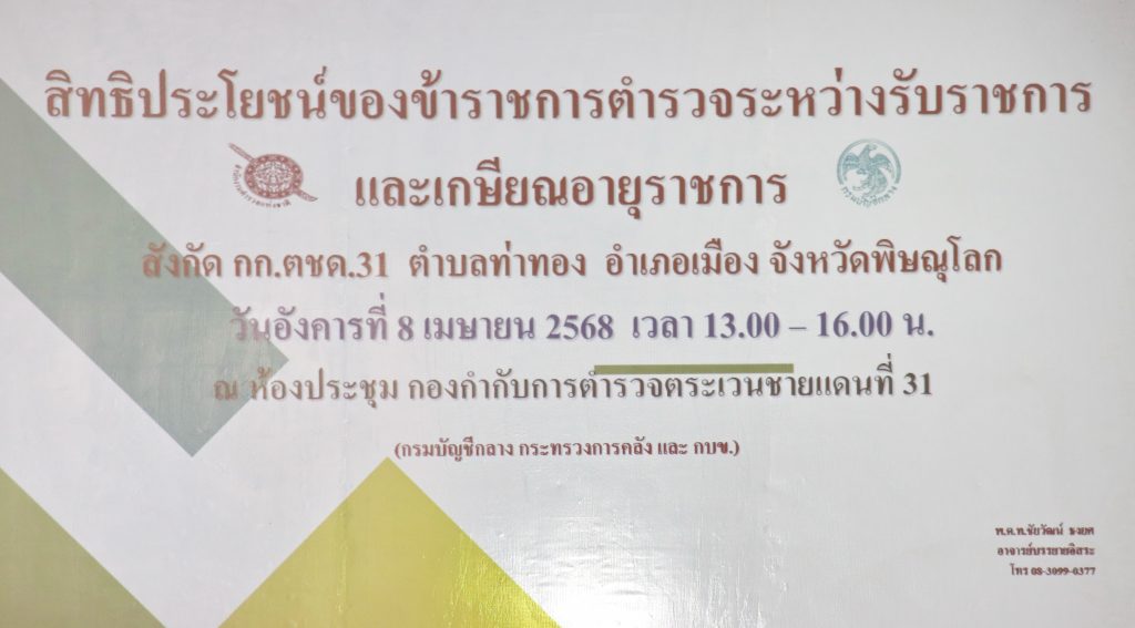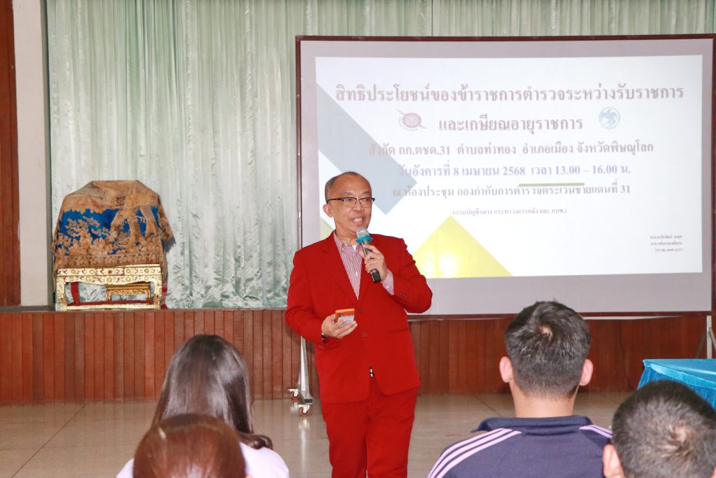 วันที่ ๘ เม.ย.๖๘ พ.ต.อ.ฐิติพงศ์ เจนกิจเจริญชัย ผกก.ตชด.๓๑ เป็นประธานเปิด การอบรมสิทธิประโยชน์ของข้าราชการตำรวจ ระหว่างรับราชการ และเกษียณอายุราชการ โดยมี พ.ต.ท.ชัยวัฒน์ ธงยศ รอง ผกก.ฝอ.บก.จร.และคณะ เป็นวิทยากร ณ อาคาร เจ้าพระยามหากษัตริย์ศึก กก.ตชด.๓๑
